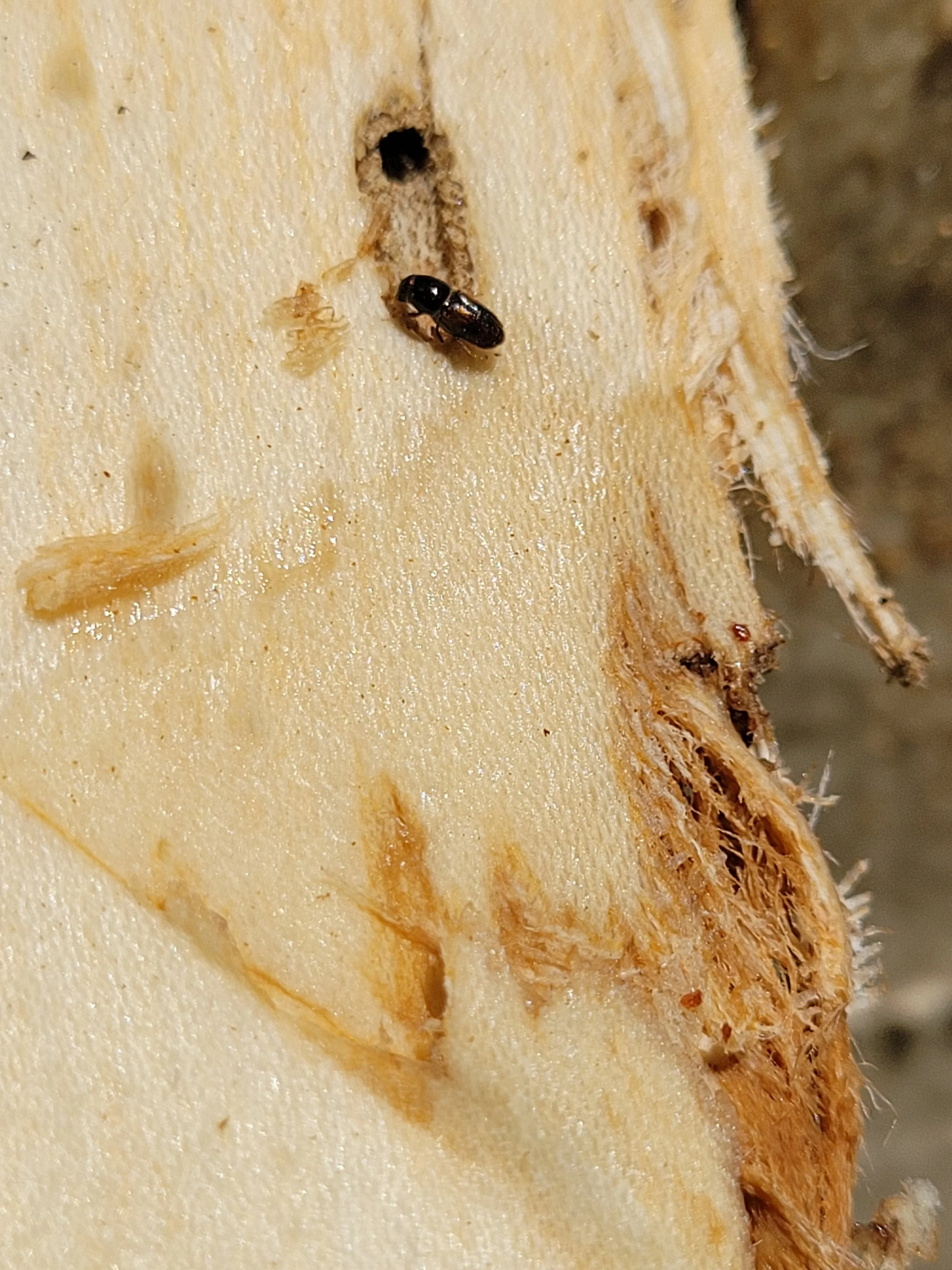 Elm bark beetle in a Siberian elm, visible after removing the bark from a cut down tree. These beetles are the main vector for Dutch Elm Disease.