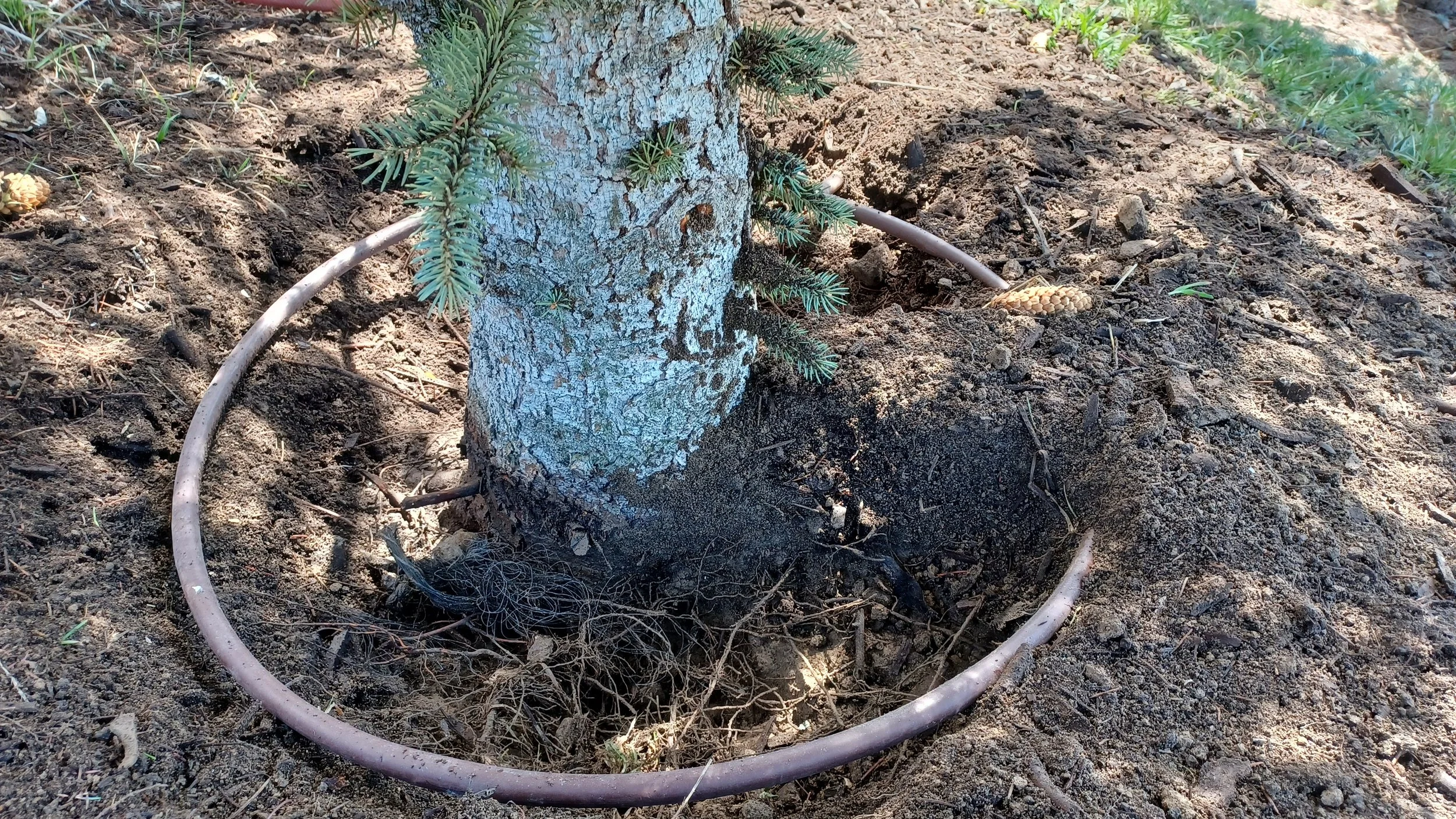 This spruce trunk was buried in over a foot of excess soil and mulch. Root crown excavation enables proper exchange of gases and nutrients critical to the tree.