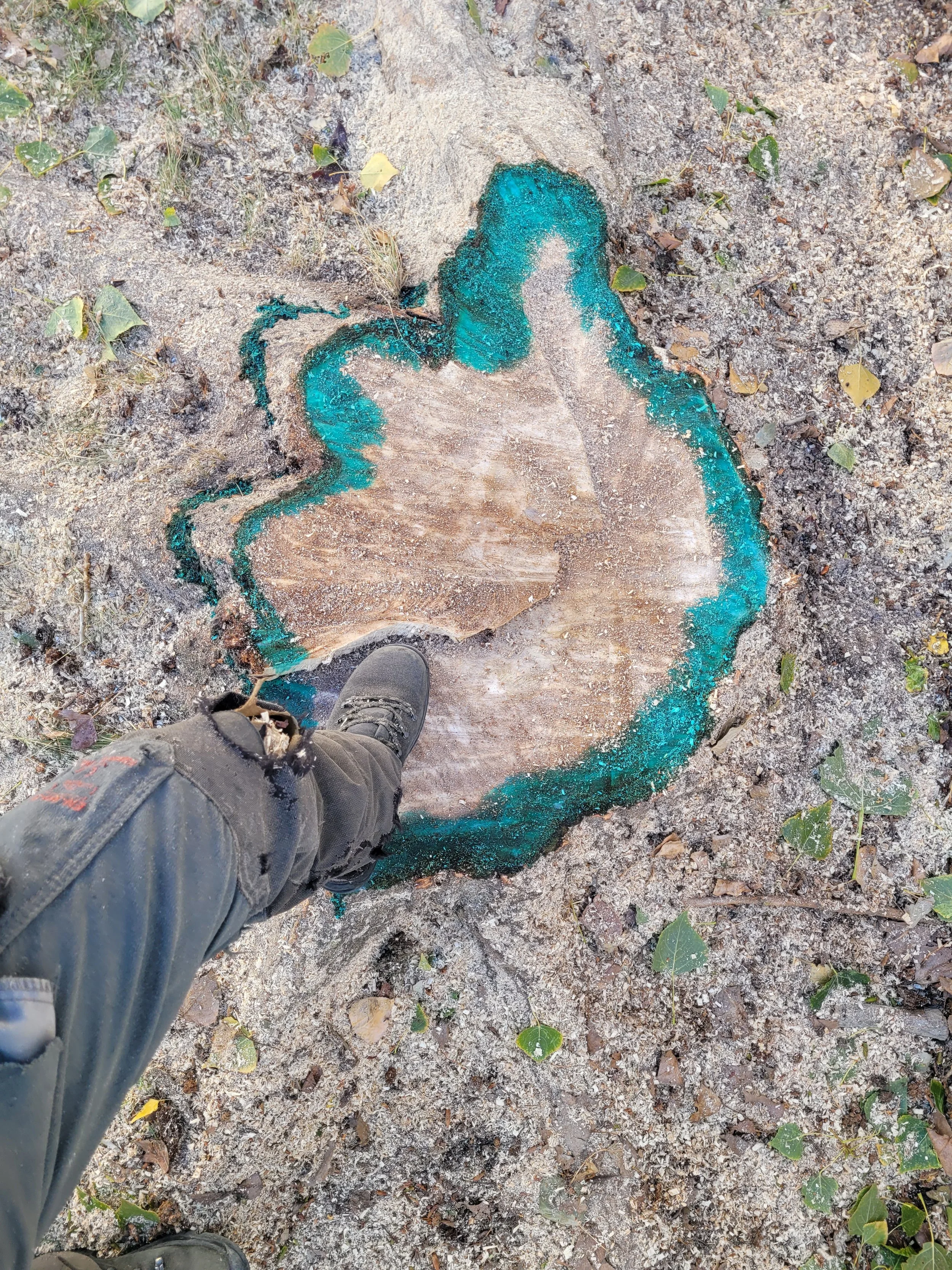 Siberian elm treated with an herbicide along the cambium to prevent regrowth.