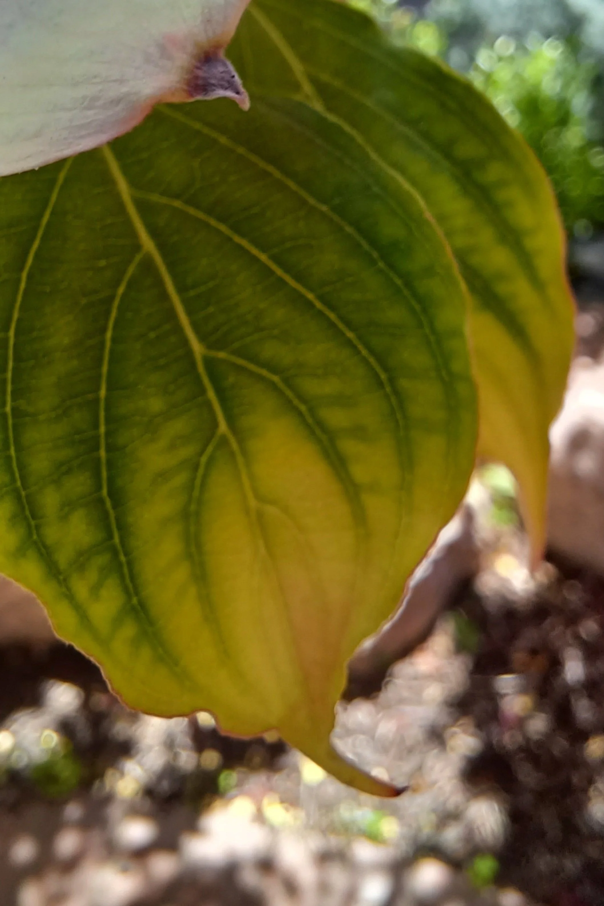 Chlorosis symptoms from a magnesium deficiency in a flowering dogwood leaf.
